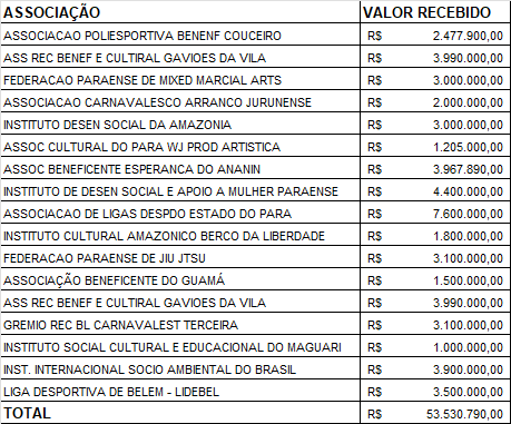 Instituto de Desenvolvimento Social da Amazônia ( Liga Mosqueirense) - Recebeu, em 2023, R$ 3.000.000, 00 da SEEL e mais R$ 2.000.000,00 da Fundação Paraense de Radio Difusão para o projeto Festival Cozinha Amazônia ( recurso decorrente de emenda Parlamentar do Dep. Nilton Neves). Sem prestação de Contas.